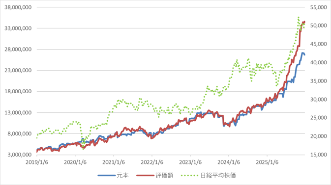 2025年も2024年に引き続き大型高配当銘柄や低PBR銘柄路線で行ったところ、良い感じに増え続けています。なんとか日経平均に追随できているのでは?